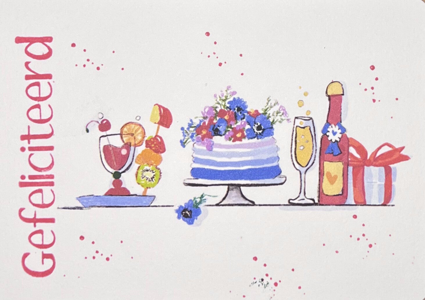 Enkele kaart op 350 grams aquarelpapier. Met tekst 'gefeliciteerd'. Samen met envelop een feestelijk cadeautje door de brievenbus.